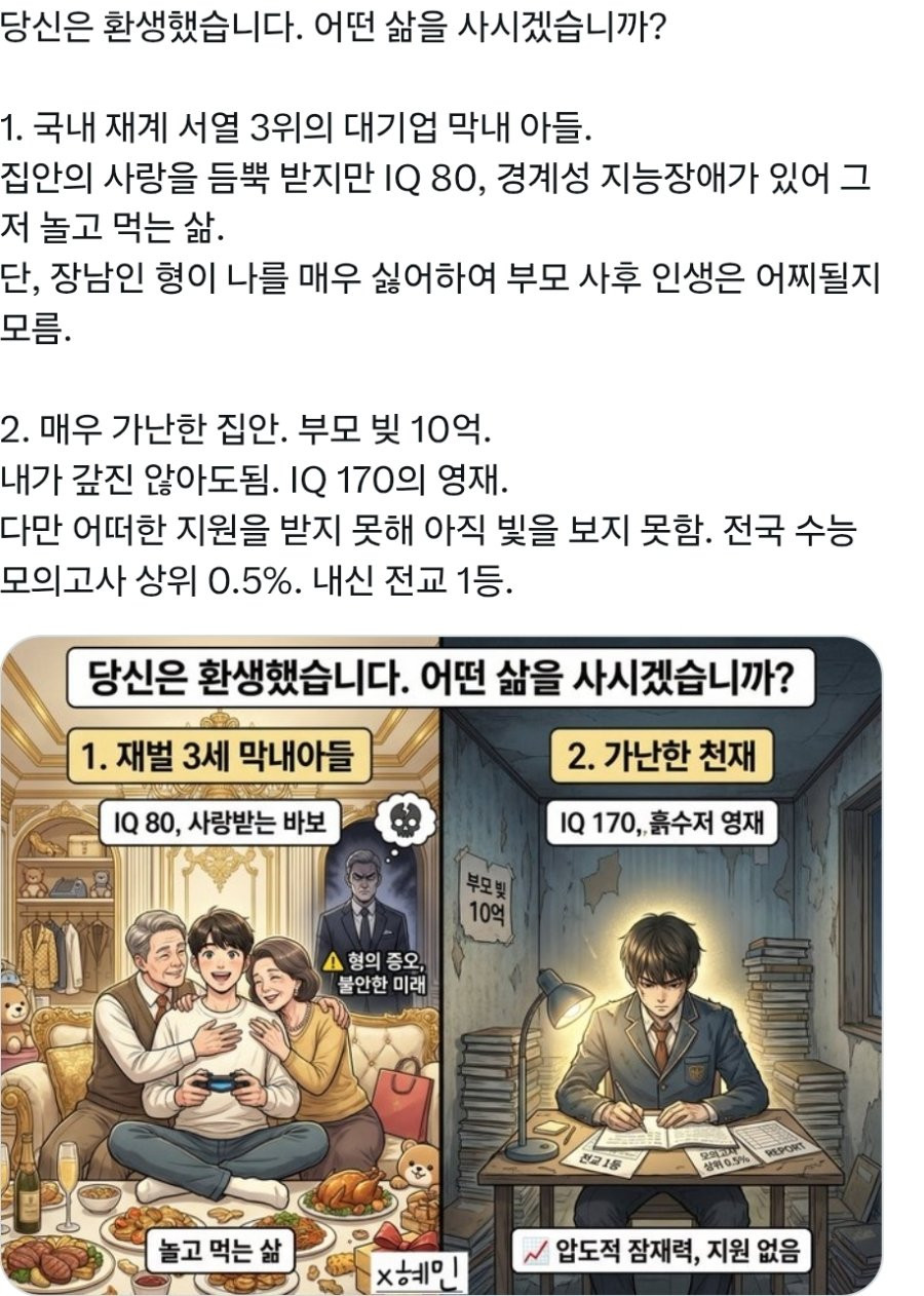 환생해서 이 둘중 하나의 인생을 고른다면?